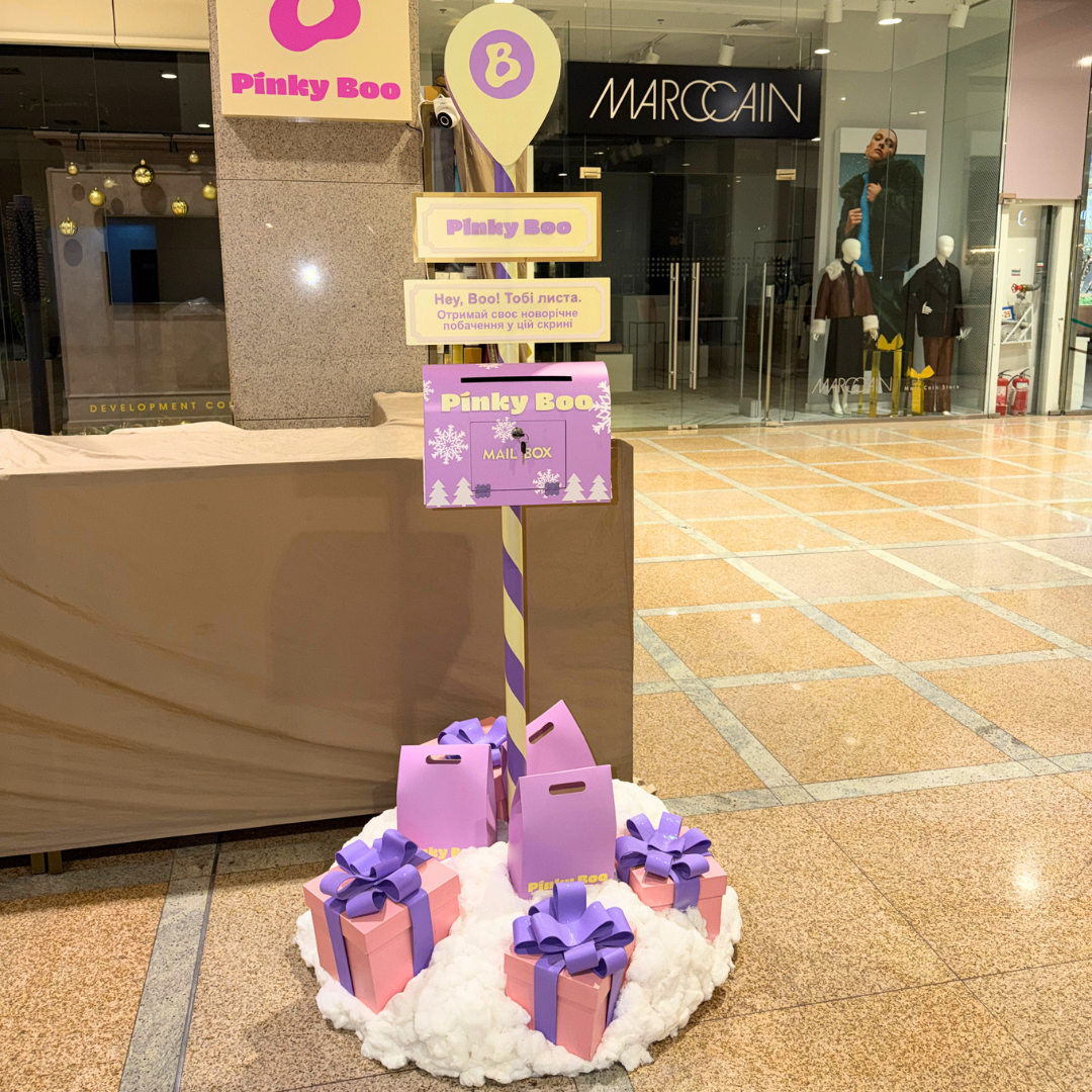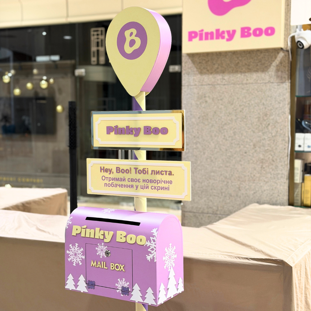 Інтерактивна конструкція Pinky Boo розроблена як яскравий інструмент комунікації з аудиторією. Формат декоративної поштової скриньки доповнений фірмовою айдентикою та елементами, що стимулюють залучення і взаємодію відвідувачів у просторі.